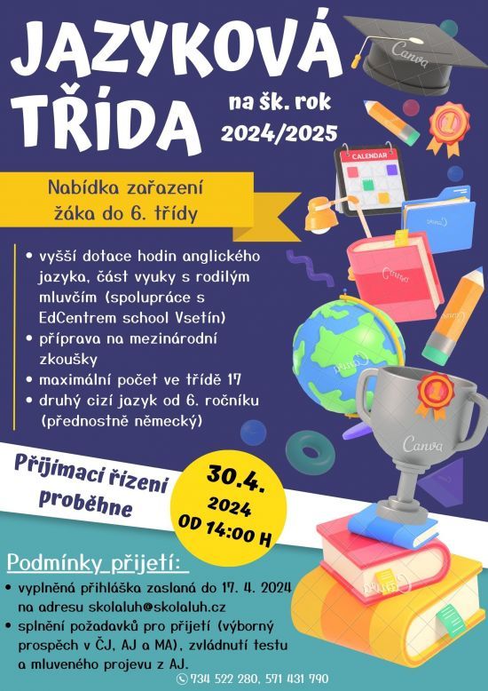 Máte dítě s talentem na cizí jazyky? Pro Vás je tu třída s rozšířenou výukou anglického jazyka. Nabízíme zařazení žáka do 6. ročníku s rozšířenou výukou AJ pro školní rok 2023-2024.